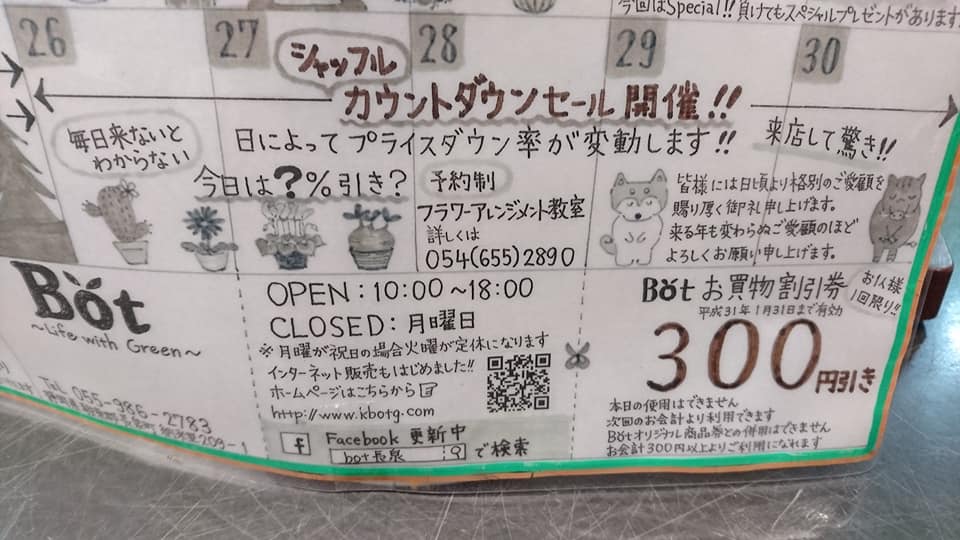 投稿日: 2018年12月26日2018年12月26日シャッフルカウントダウン開催 こんにちは今日も元気に営業しています。クリスマスも過ぎあと数日でおしょうがつですね!本日よりシャッフルカウントダウン開催!!毎日変動するので毎日来店しないとわからない驚きのプライスでお待ちしています。